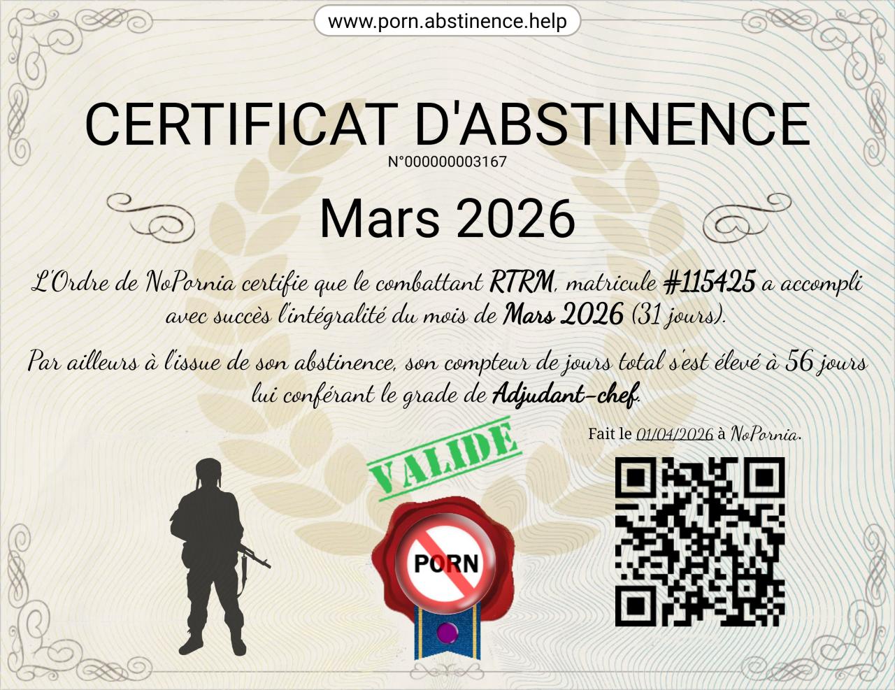 - J22 Bon bah 5 eme masturbation depuis 22 jours mais toujours sans ce maudit porno. Il faut que j'apprenne à contrôler mes pulsions. Le mieux étant de faire un StopFap no porn plutôt que juste un no porn. Mais bon je suis content 22 jours sans regardé des scènes x sur internet,c'est déjà une petite victoire personnel.Reste plus que 8 jours et je pourrais être fier de mon objectif.Nouveau grade obtenu : SergentÀ la Une 302 3j 06m16s